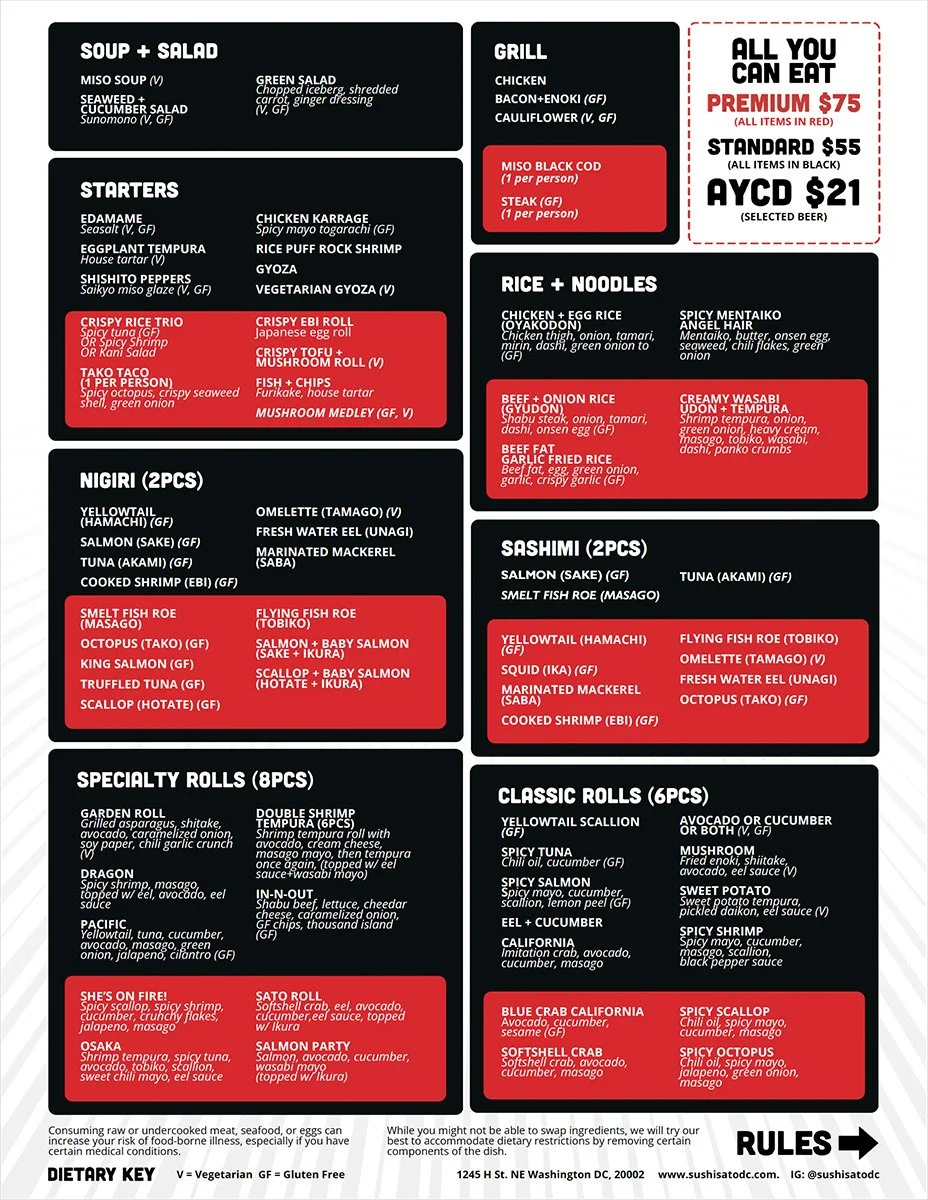 Our AYCE $55 offers classic dishes from sushi bar to the kitchen, and the AYCE $75 unlocks both the classic dishes and our highlight dishes for those seeking for the full experience.